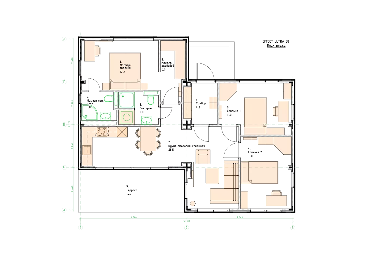 Модель "DoorHan Ультра 88" представляет одноэтажный дом современного дизайна общей площадью 88 квадратных метров. Этот компактный и экономичный вариант отлично подходит для маленькой семьи или пары, ищущей уютное и функциональное жилище.